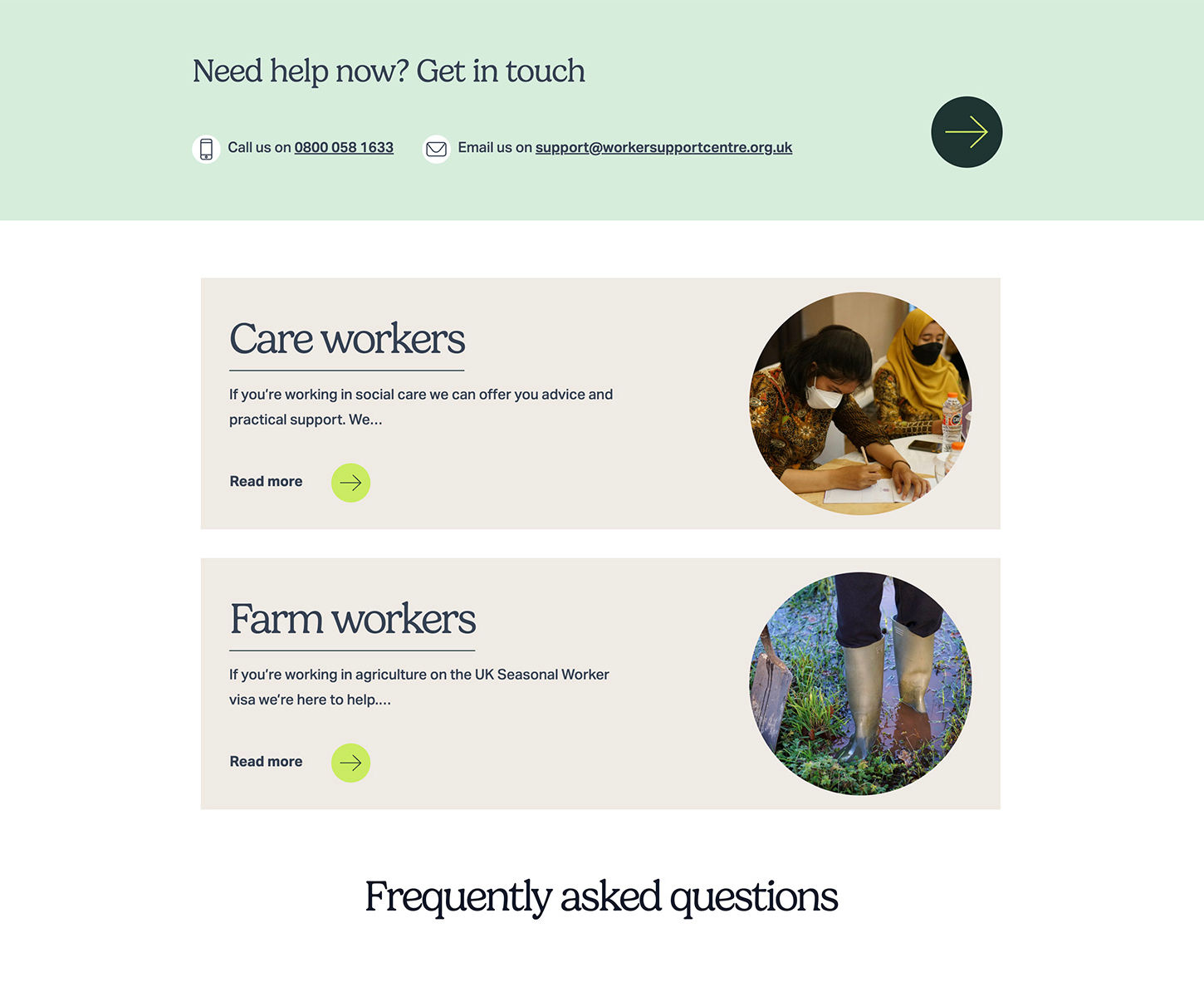 We delivered a website that reflects the organisation’s values and amplifies the voices of the workers it exists to support, offering both frontline engagement with the workers themselves alongside strategic communication with policymakers and funders. Choosing to structure important help content by sector, we future-proofed the website to ensure their move from supporting farm workers to care workers and beyond was hassle-free.